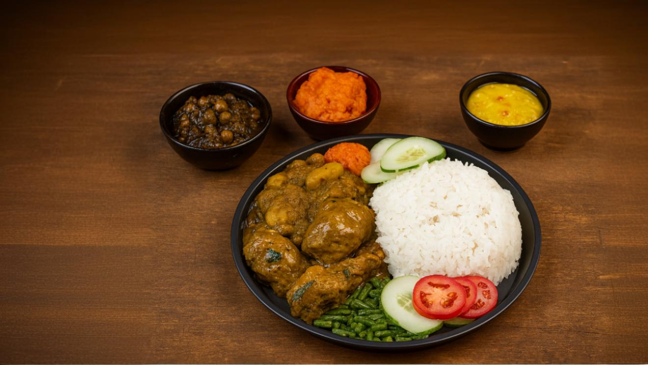 - White rice with curry chicken, potatoes, pumpkin, eggplant.