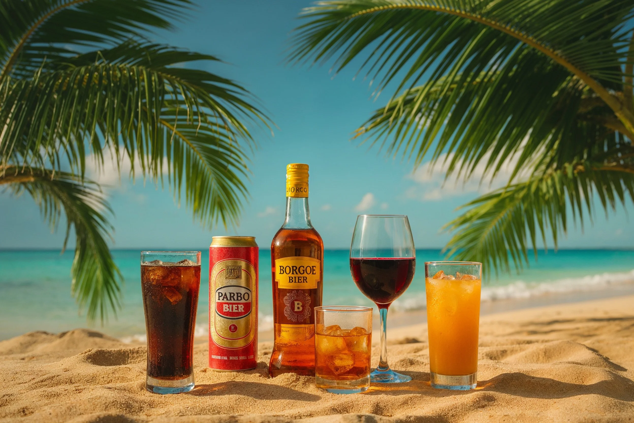 Soda, Beer, Bottle of Borgoe Rum, Water, Wine and Juice